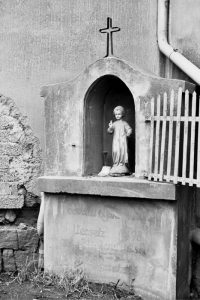 Das Kreuz Nr. 13 am Abzweig zur Fa. Eschenauer steckte locker in einen zugeschütteten Basaltfuß. Die Anlage wurde vollständig ausgebaut, gereinigt und auf dem nun sichtbaren Fuß aufgestellt. Vor der Bimsausbeute stand das Kreuz auf dem gegenüberliegenden Feldrain.